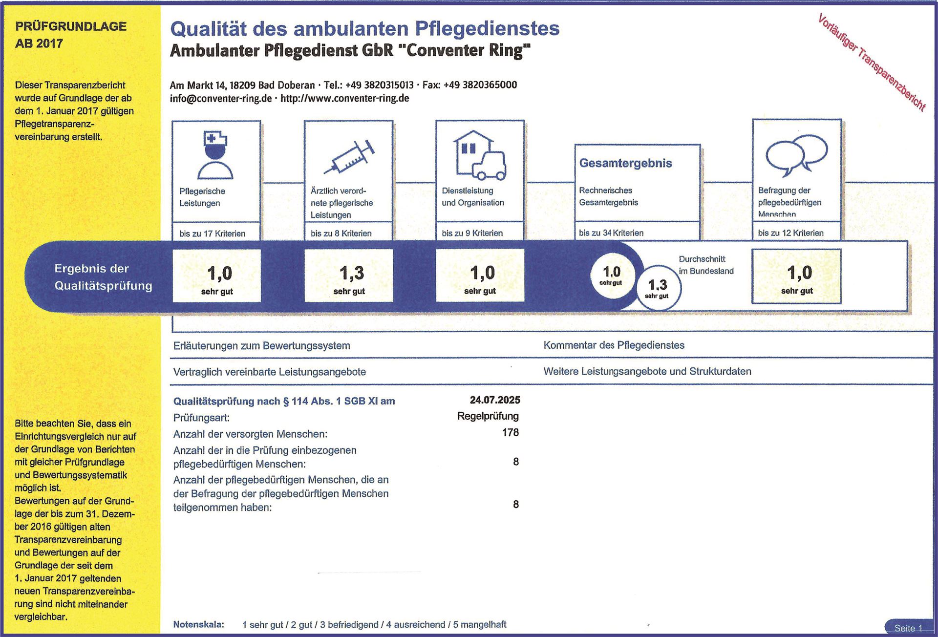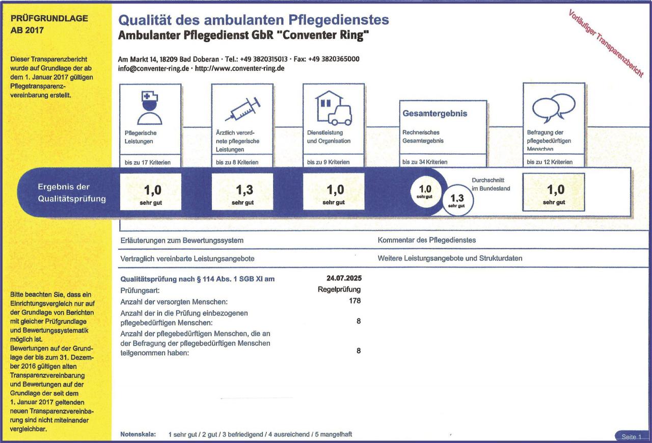Jährlich führt der medizinische Dienst der Krankenkassen (MDK) eine Qualitätsprüfung der Pflegedienste durch. Im Folgenden finden Sie die Bewertung sowie den Prüfbericht unseres Unternehmens zur Ansicht.